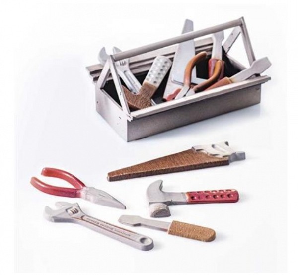 To so čokoladna žaga, izvijač, kladivo, klešče in ključ.